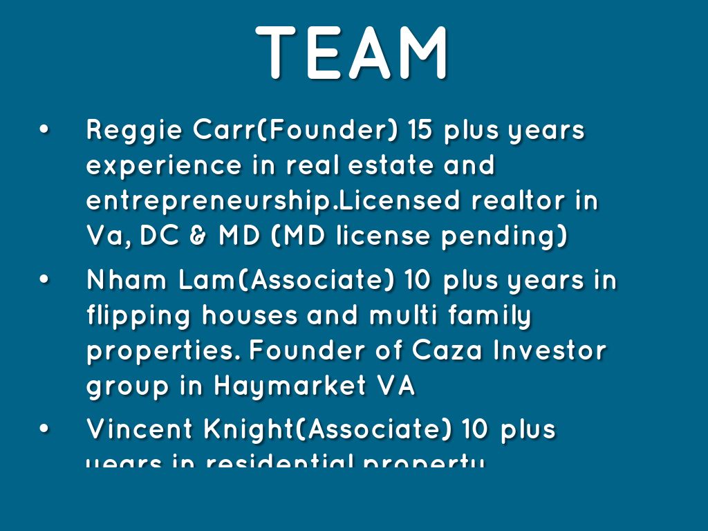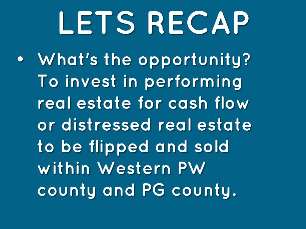 What's the opportunity? To invest in performing real estate for cash flow or distressed real estate to be flipped and sold within Western PW county and PG county.