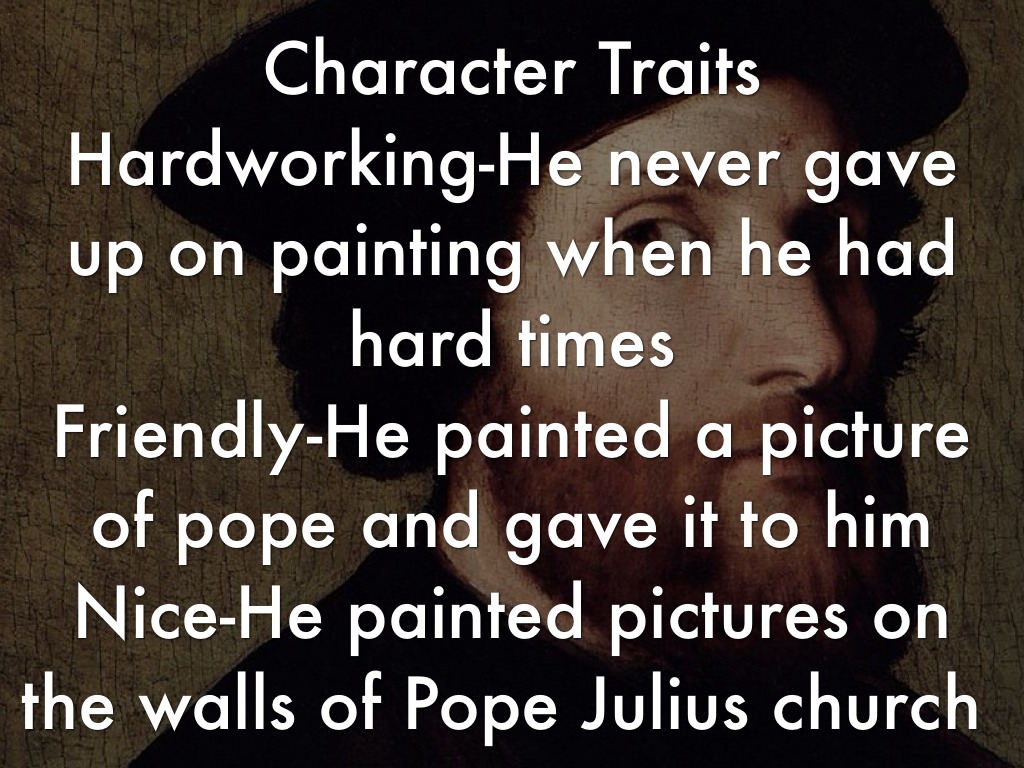 Character Traits Hardworking-He never gave up on painting when he had hard times Friendly-He painted a picture of pope and gave it to him Nice-He painted pictures on the walls of Pope Julius church