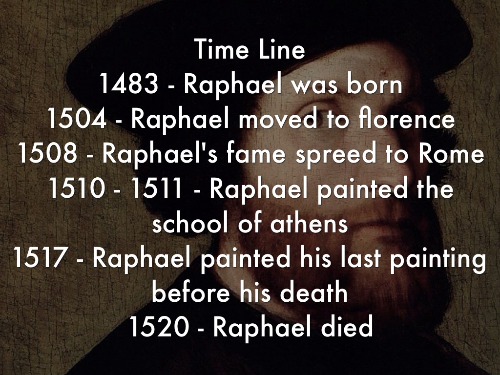 Time Line 1483 - Raphael was born 1504 - Raphael moved to florence 1508 - Raphael's fame spreed to Rome 1510 - 1511 - Raphael painted the school of athens 1517 - Raphael painted his last painting before his death 1520 - Raphael died