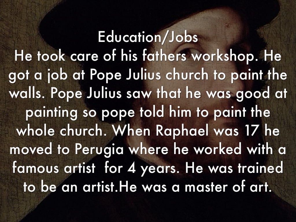 Education/Jobs He took care of his fathers workshop. He got a job at Pope Julius church to paint the walls. Pope Julius saw that he was good at painting so pope told him to paint the whole church. When Raphael was 17 he moved to Perugia where he worked with a famous artist for 4 years. He was trained to be an artist.He was a master of art.