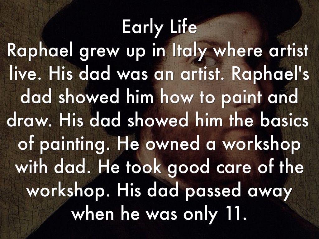 Early Life Raphael grew up in Italy where artist live. His dad was an artist. Raphael's dad showed him how to paint and draw. His dad showed him the basics of painting. He owned a workshop with dad. He took good care of the workshop. His dad passed away when he was only 11.