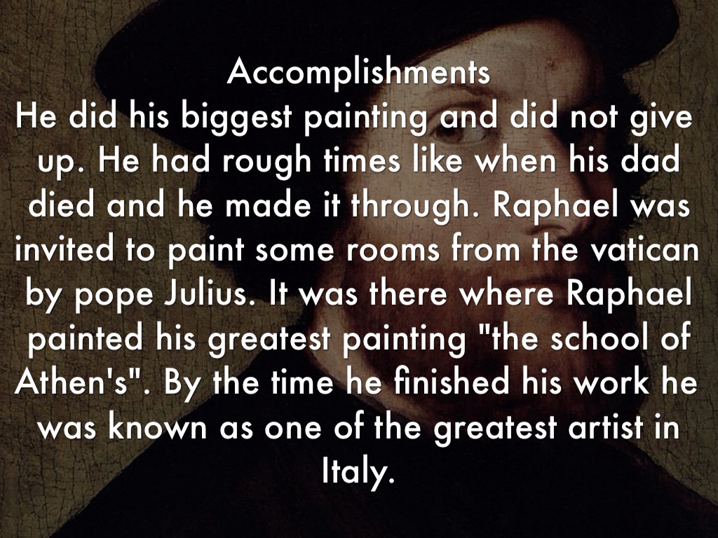 Accomplishments He did his biggest painting and did not give up. He had rough times like when his dad died and he made it through. Raphael was invited to paint some rooms from the vatican by pope Julius. It was there where Raphael painted his greatest painting "the school of Athen's". By the time he finished his work he was known as one of the greatest artist in Italy.