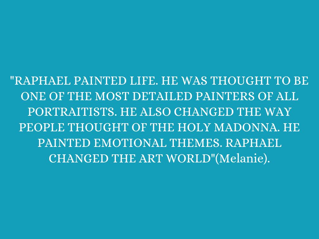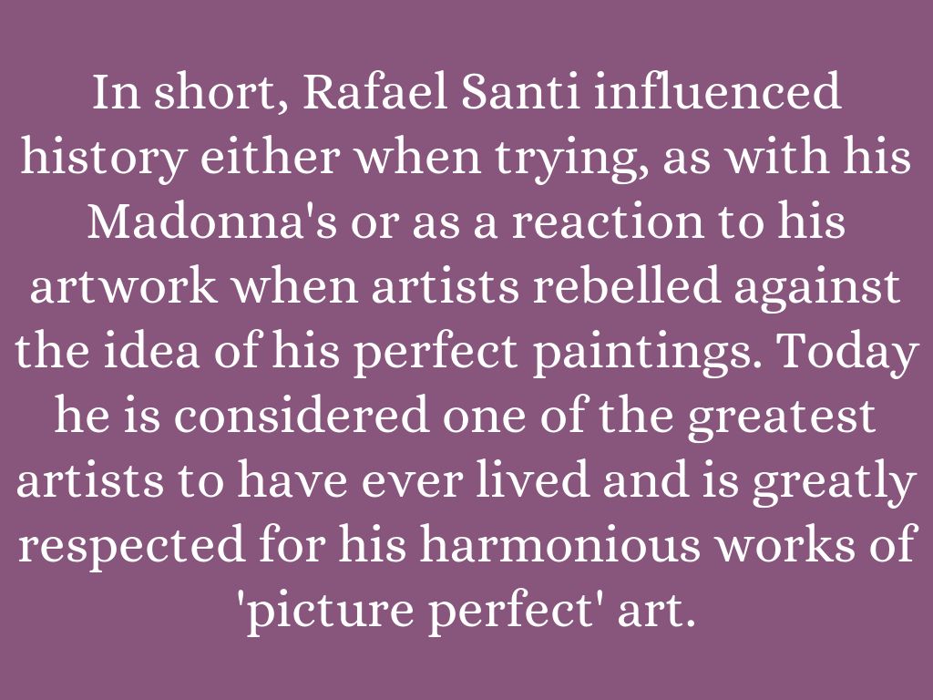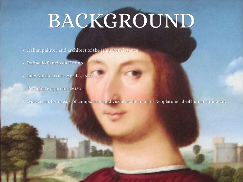 - Work: clear form, ease of composition and visual achievment of Neoplatonic ideal human grandeur.