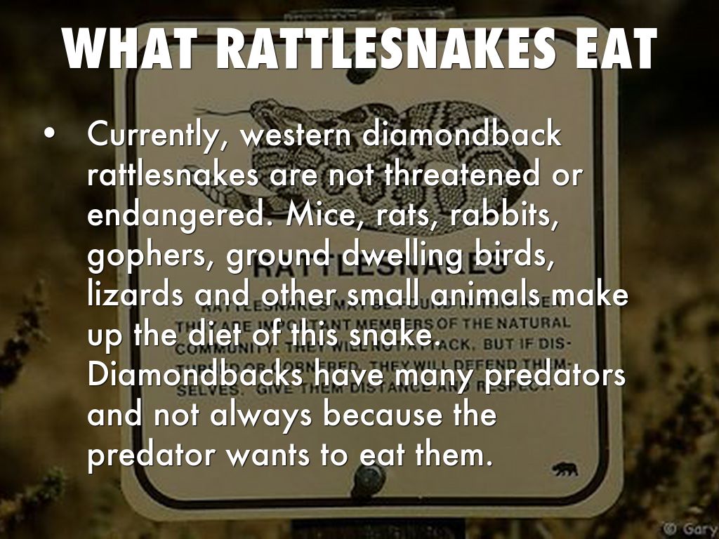 Currently, western diamondback rattlesnakes are not threatened or endangered. Mice, rats, rabbits, gophers, ground dwelling birds, lizards and other small animals make up the diet of this snake. Diamondbacks have many predators and not always because the predator wants to eat them.