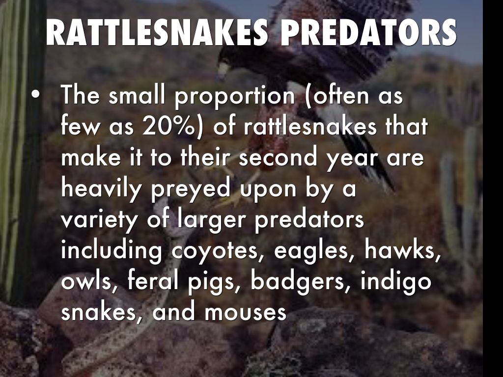 The small proportion (often as few as 20%) of rattlesnakes that make it to their second year are heavily preyed upon by a variety of larger predators including coyotes, eagles, hawks, owls, feral pigs, badgers, indigo snakes, and mouses