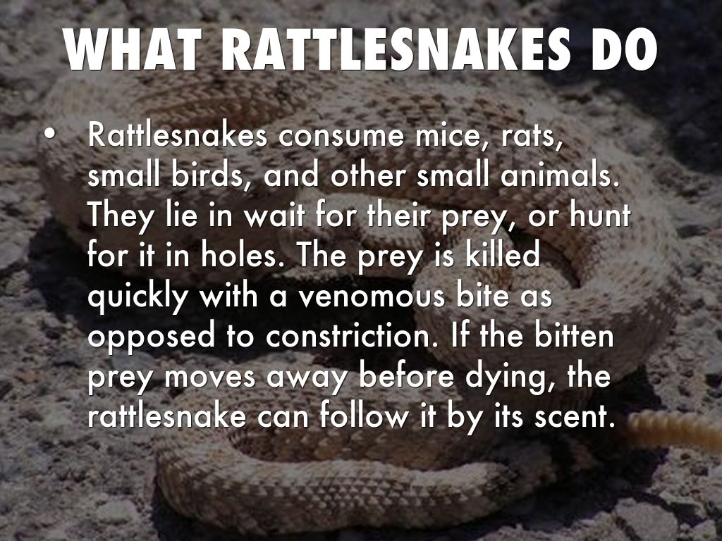 Rattlesnakes consume mice, rats, small birds, and other small animals. They lie in wait for their prey, or hunt for it in holes. The prey is killed quickly with a venomous bite as opposed to constriction. If the bitten prey moves away before dying, the rattlesnake can follow it by its scent.