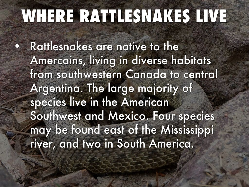 Rattlesnakes are native to the Amercains, living in diverse habitats from southwestern Canada to central Argentina. The large majority of species live in the American Southwest and Mexico. Four species may be found east of the Mississippi river, and two in South America.