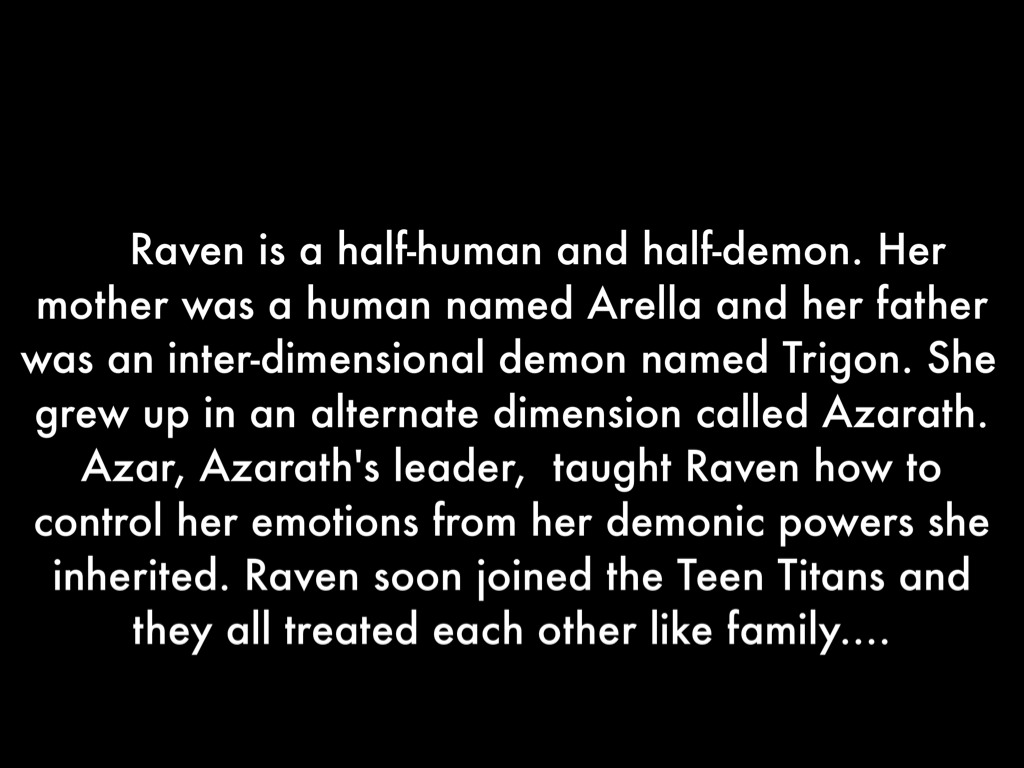 Raven is a half-human and half-demon. Her mother was a human named Arella and her father was an inter-dimensional demon named Trigon. She grew up in an alternate dimension called Azarath. Azar, Azarath's leader, taught Raven how to control her emotions from her demonic powers she inherited. Raven soon joined the Teen Titans and they all treated each other like family.