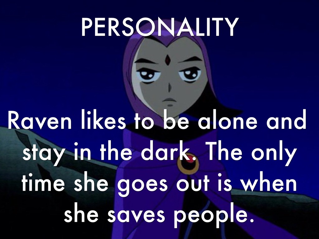 Raven likes to be alone and stay in the dark. The only time she goes out is when she saves people.