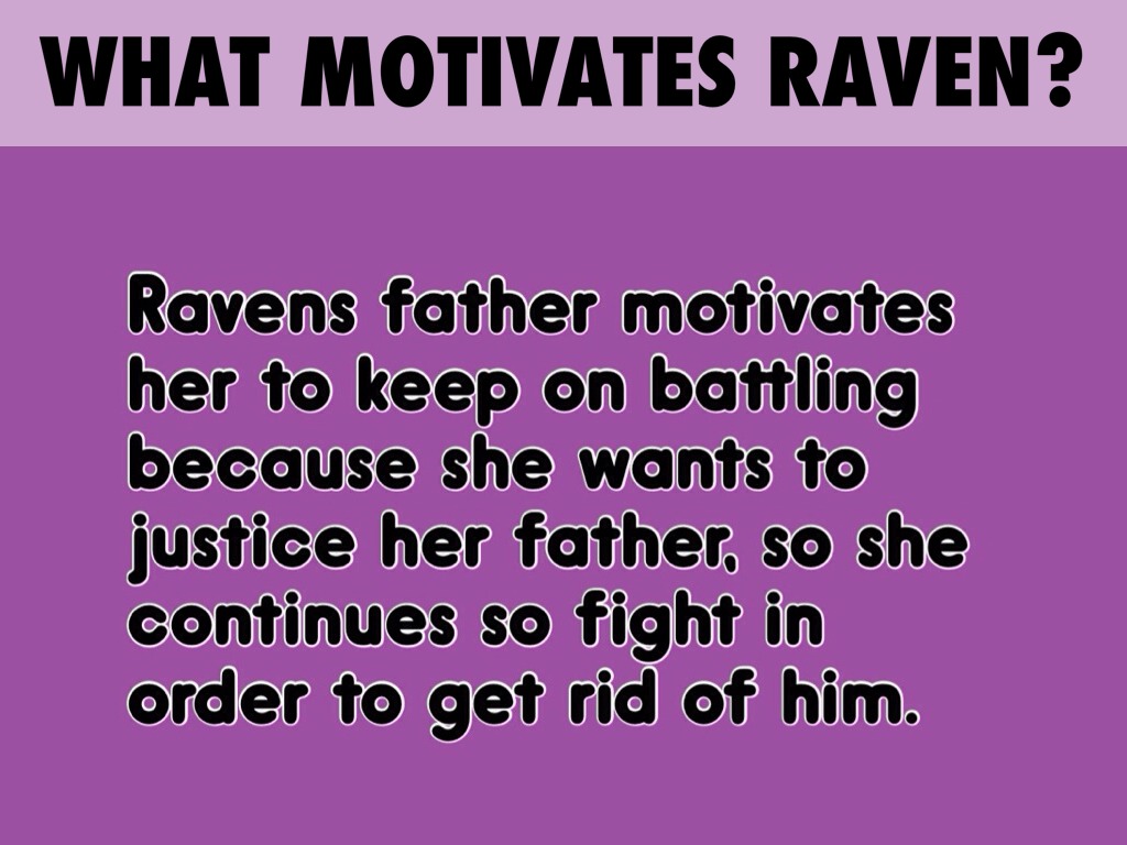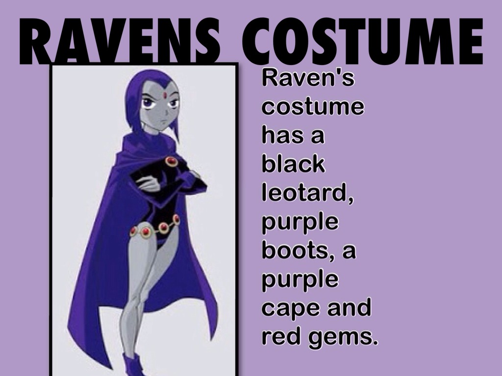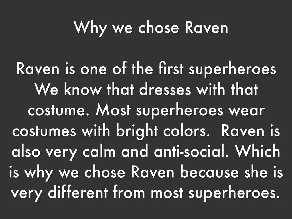 Raven is one of the first superheroes We know that dresses with that costume. Most superheroes wear costumes with bright colors. Raven is also very calm and anti-social. Which is why we chose Raven because she is very different from most superheroes.