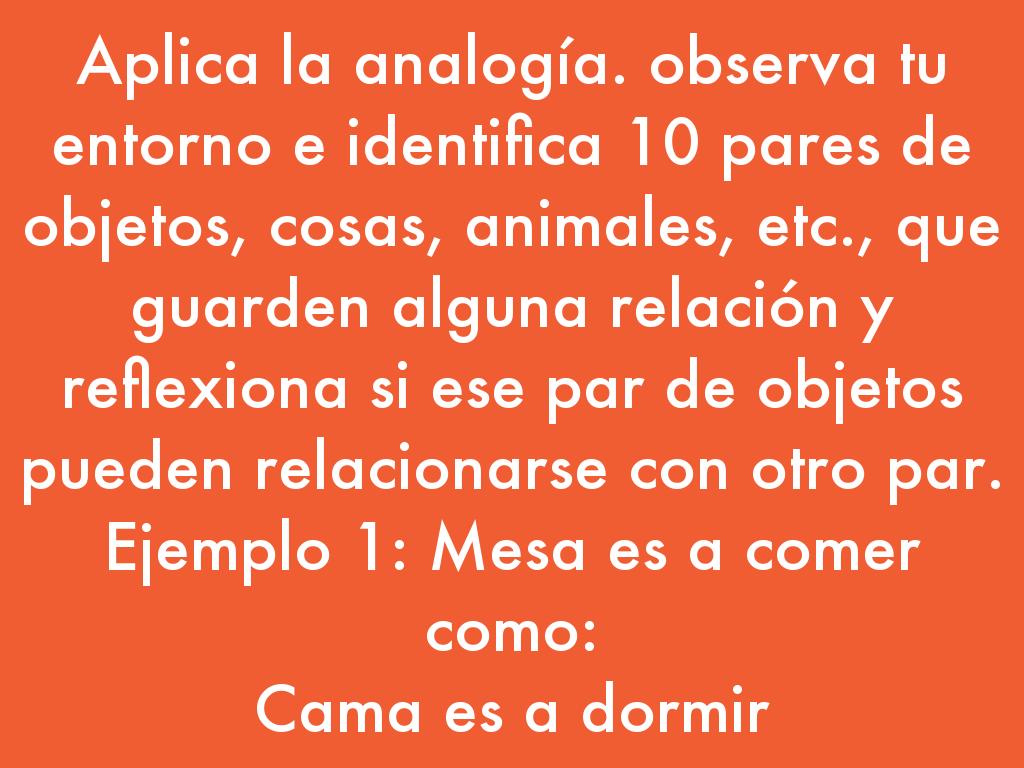 Aplica la analogía. observa tu entorno e identifica 10 pares de objetos, cosas, animales, etc., que guarden alguna relación y reflexiona si ese par de objetos pueden relacionarse con otro par. Ejemplo 1: Mesa es a comer como: Cama es a dormir