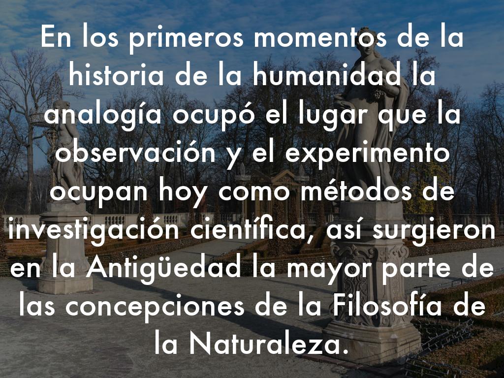 En los primeros momentos de la historia de la humanidad la analogía ocupó el lugar que la observación y el experimento ocupan hoy como métodos de investigación científica, así surgieron en la Antigüedad la mayor parte de las concepciones de la Filosofía de la Naturaleza.