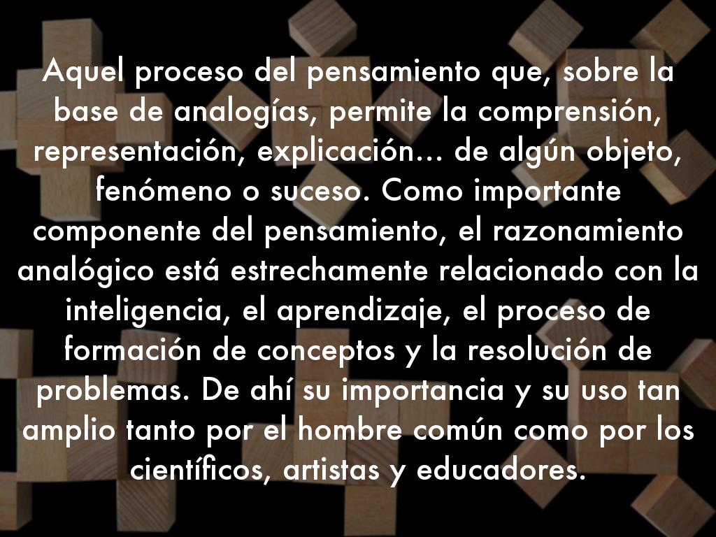 Aquel proceso del pensamiento que, sobre la base de analogías, permite la comprensión, representación, explicación... de algún objeto, fenómeno o suceso. Como importante componente del pensamiento, el razonamiento analógico está estrechamente relacionado con la inteligencia, el aprendizaje, el proceso de formación de conceptos y la resolución de problemas. De ahí su importancia y su uso tan amplio tanto por el hombre común como por los científicos, artistas y educadores.