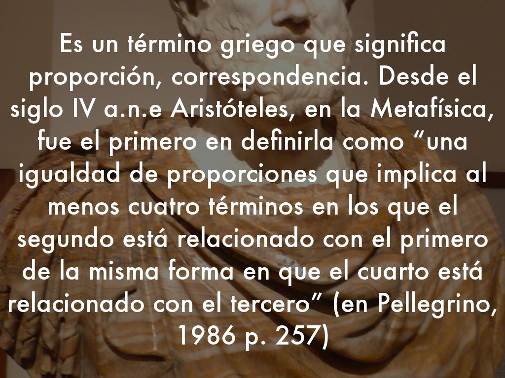 Es un término griego que significa proporción, correspondencia. Desde el siglo IV a.n.e Aristóteles, en la Metafísica, fue el primero en definirla como “una igualdad de proporciones que implica al menos cuatro términos en los que el segundo está relacionado con el primero de la misma forma en que el cuarto está relacionado con el tercero” (en Pellegrino, 1986 p. 257)