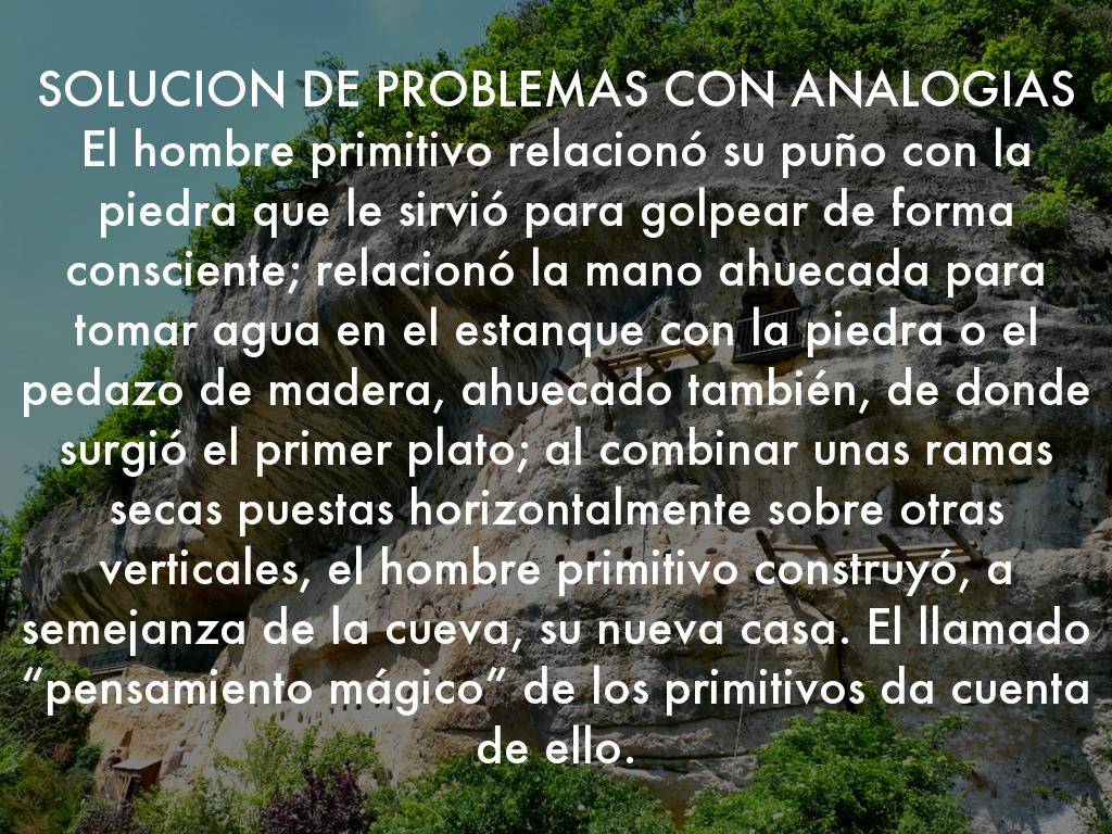 SOLUCION DE PROBLEMAS CON ANALOGIAS El hombre primitivo relacionó su puño con la piedra que le sirvió para golpear de forma consciente; relacionó la mano ahuecada para tomar agua en el estanque con la piedra o el pedazo de madera, ahuecado también, de donde surgió el primer plato; al combinar unas ramas secas puestas horizontalmente sobre otras verticales, el hombre primitivo construyó, a semejanza de la cueva, su nueva casa. El llamado “pensamiento mágico” de los primitivos da cuenta de ello.