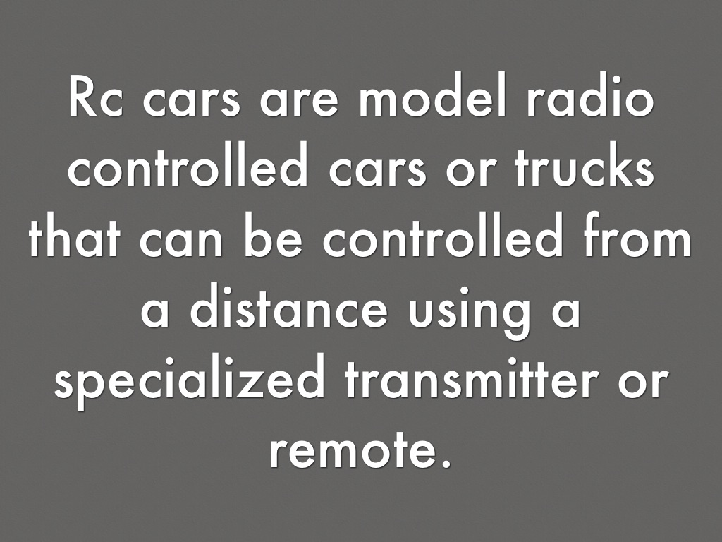 Rc cars are model radio controlled cars or trucks that can be controlled from a distance using a specialized transmitter or remote.