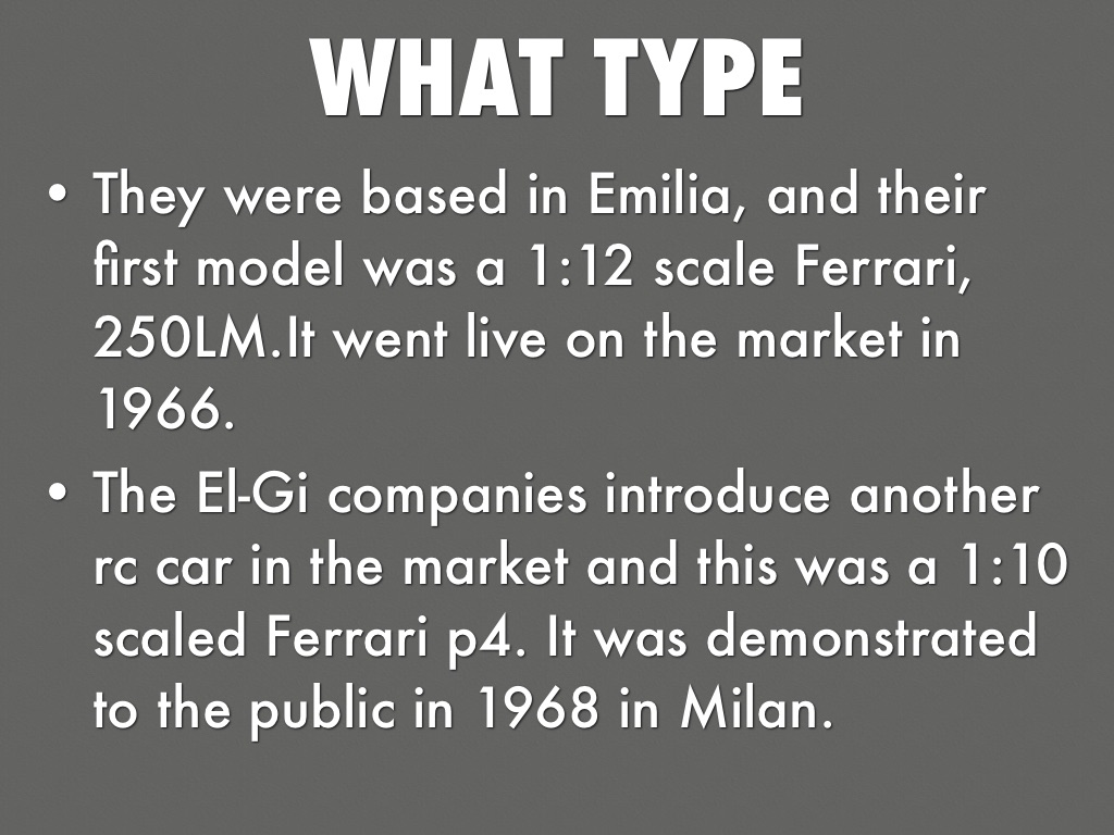 They were based in Emilia, and their first model was a 1:12 scale Ferrari,