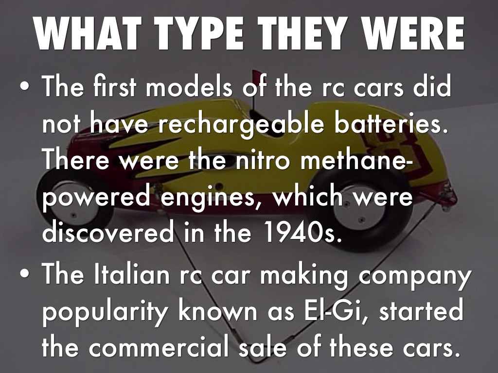 The first models of the rc cars did not have rechargeable batteries. There were the nitro methane-powered engines, which were discovered in the 1940s.