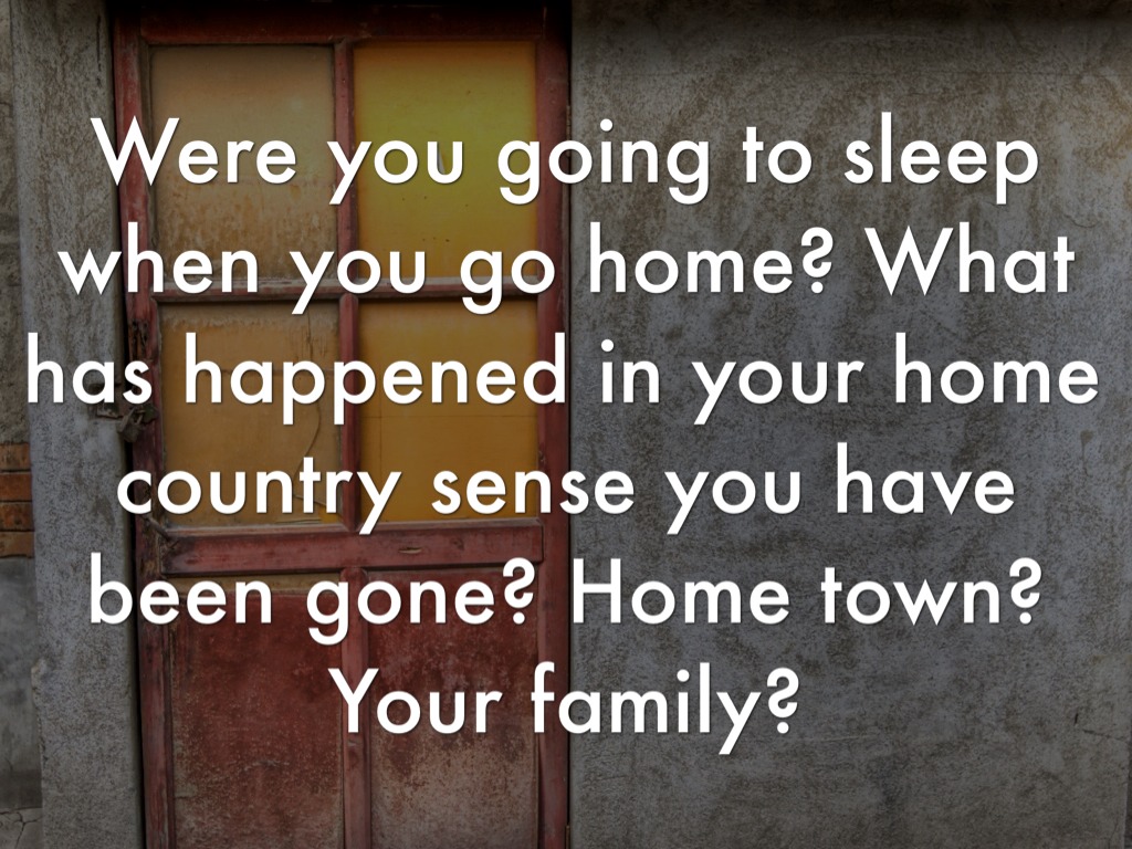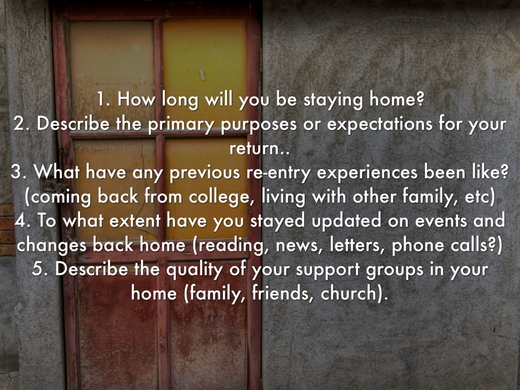 1. How long will you be staying home? 2. Describe the primary purposes or expectations for your return.. 3. What have any previous re-entry experiences been like? (coming back from college, living with other family, etc) 4. To what extent have you stayed updated on events and changes back home (reading, news, letters, phone calls?) 5. Describe the quality of your support groups in your home (family, friends, church).