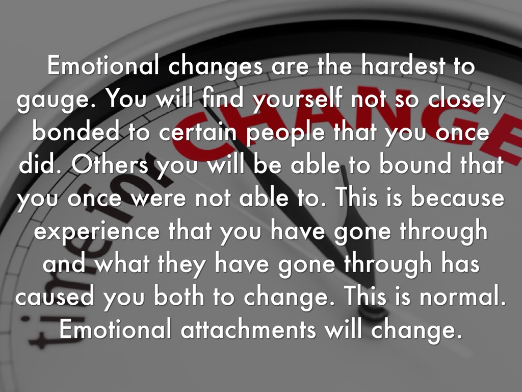 Emotional changes are the hardest to gauge. You will find yourself not so closely bonded to certain people that you once did. Others you will be able to bound that you once were not able to. This is because experience that you have gone through and what they have gone through has caused you both to change. This is normal. Emotional attachments will change.