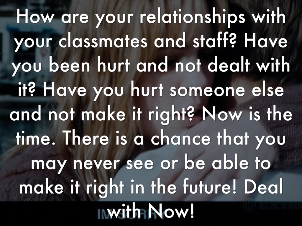 How are your relationships with your classmates and staff? Have you been hurt and not dealt with it? Have you hurt someone else and not make it right? Now is the time. There is a chance that you may never see or be able to make it right in the future! Deal with Now!