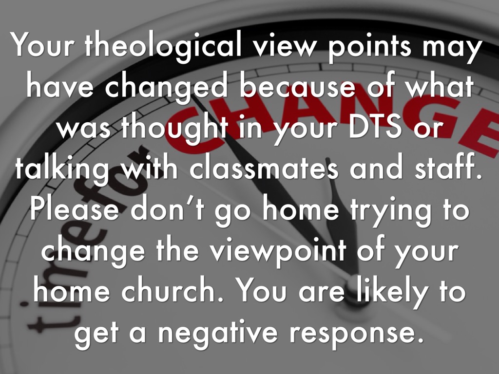Your theological view points may have changed because of what was thought in your DTS or talking with classmates and staff. Please don’t go home trying to change the viewpoint of your home church. You are likely to get a negative response.