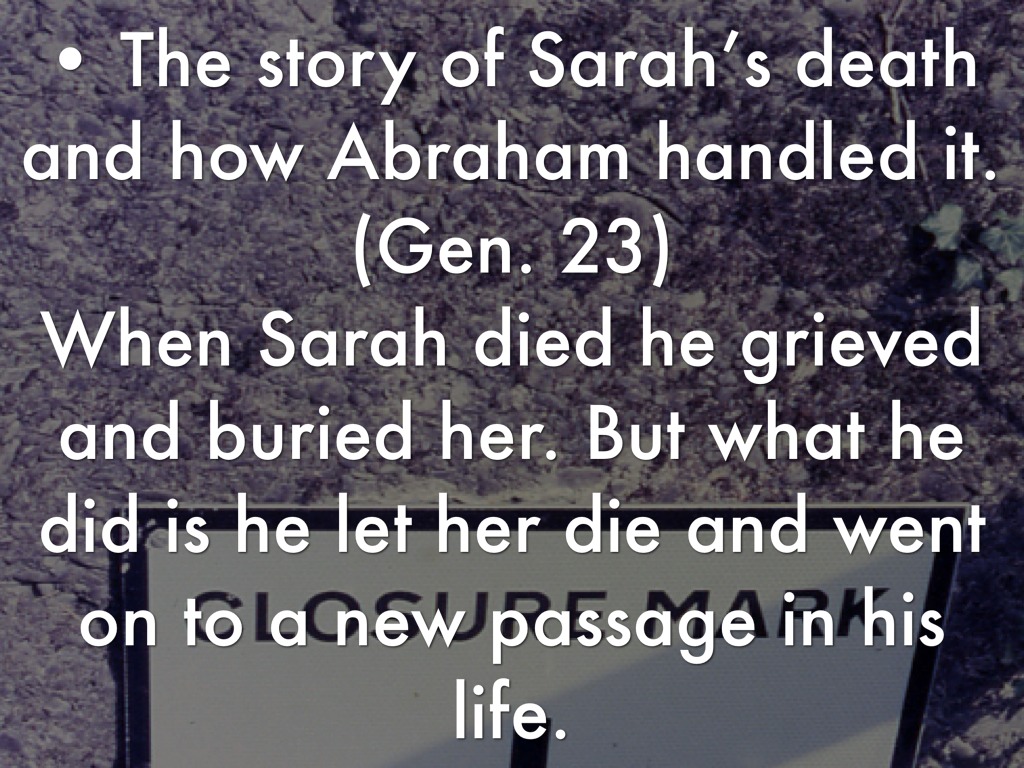 • The story of Sarah’s death and how Abraham handled it. (Gen. 23) When Sarah died he grieved and buried her. But what he did is he let her die and went on to a new passage in his life.