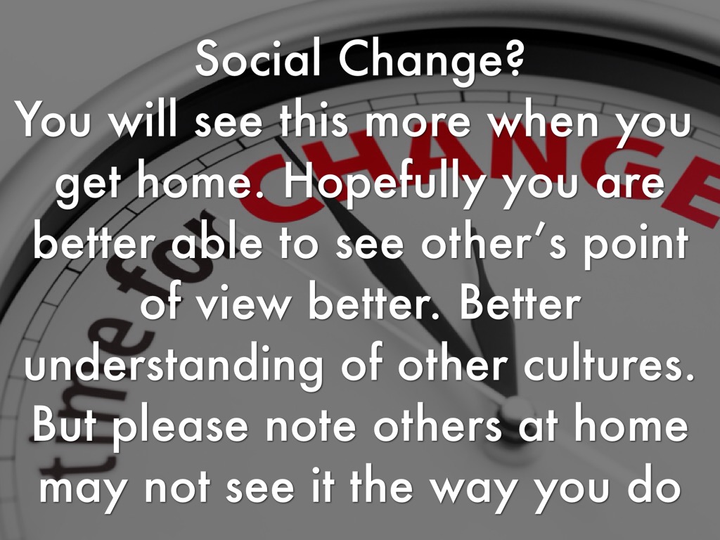 Social Change? You will see this more when you get home. Hopefully you are better able to see other’s point of view better. Better understanding of other cultures. But please note others at home may not see it the way you do