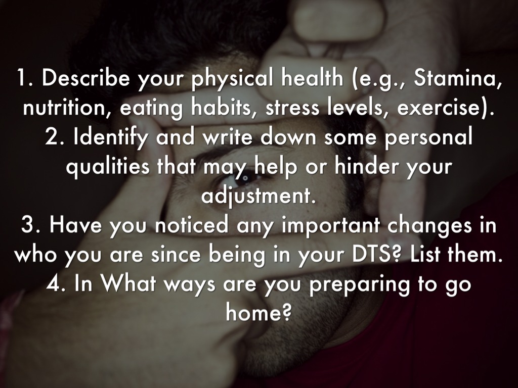 1. Describe your physical health (e.g., Stamina, nutrition, eating habits, stress levels, exercise). 2. Identify and write down some personal qualities that may help or hinder your adjustment. 3. Have you noticed any important changes in who you are since being in your DTS? List them. 4. In What ways are you preparing to go home?