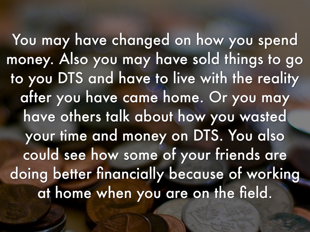 You may have changed on how you spend money. Also you may have sold things to go to you DTS and have to live with the reality after you have came home. Or you may have others talk about how you wasted your time and money on DTS. You also could see how some of your friends are doing better financially because of working at home when you are on the field.
