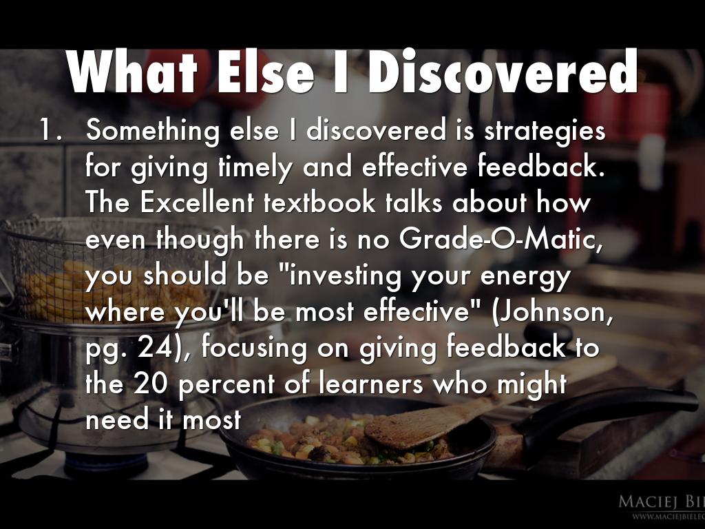 Something else I discovered is strategies for giving timely and effective feedback. The Excellent textbook talks about how even though there is no Grade-O-Matic, you should be "investing your energy where you'll be most effective" (Johnson, pg. 24), focusing on giving feedback to the 20 percent of learners who might need it most