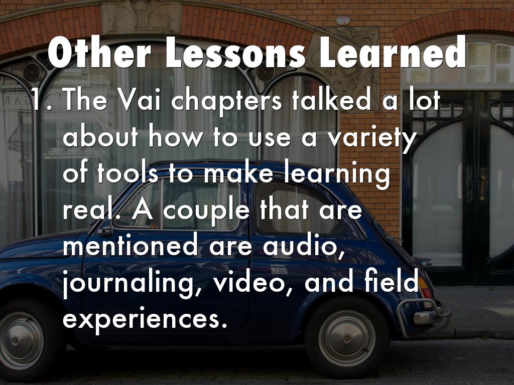 The Vai chapters talked a lot about how to use a variety of tools to make learning real. A couple that are mentioned are audio, journaling, video, and field experiences.