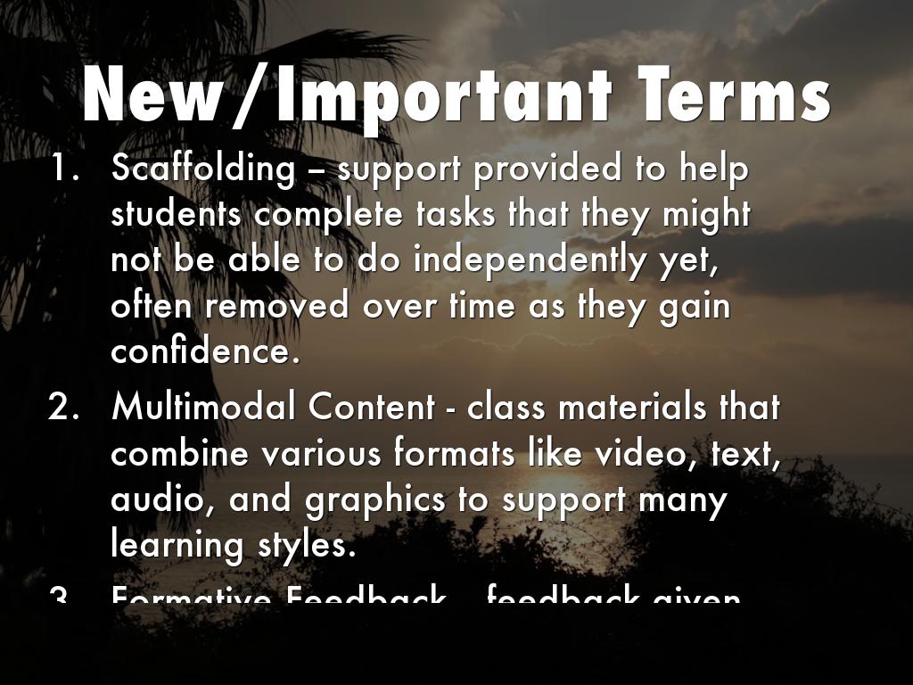 Scaffolding -- support provided to help students complete tasks that they might not be able to do independently yet, often removed over time as they gain confidence.