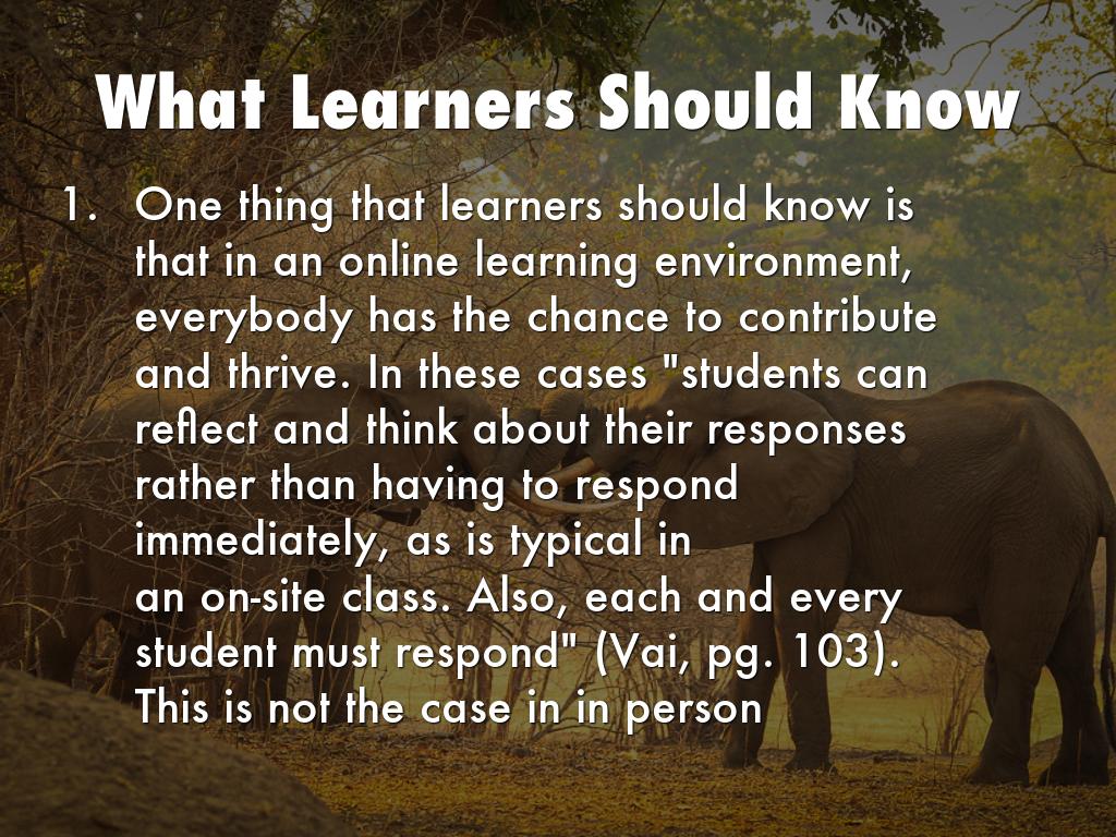 One thing that learners should know is that in an online learning environment, everybody has the chance to contribute and thrive. In these cases "students can reflect and think about their responses
