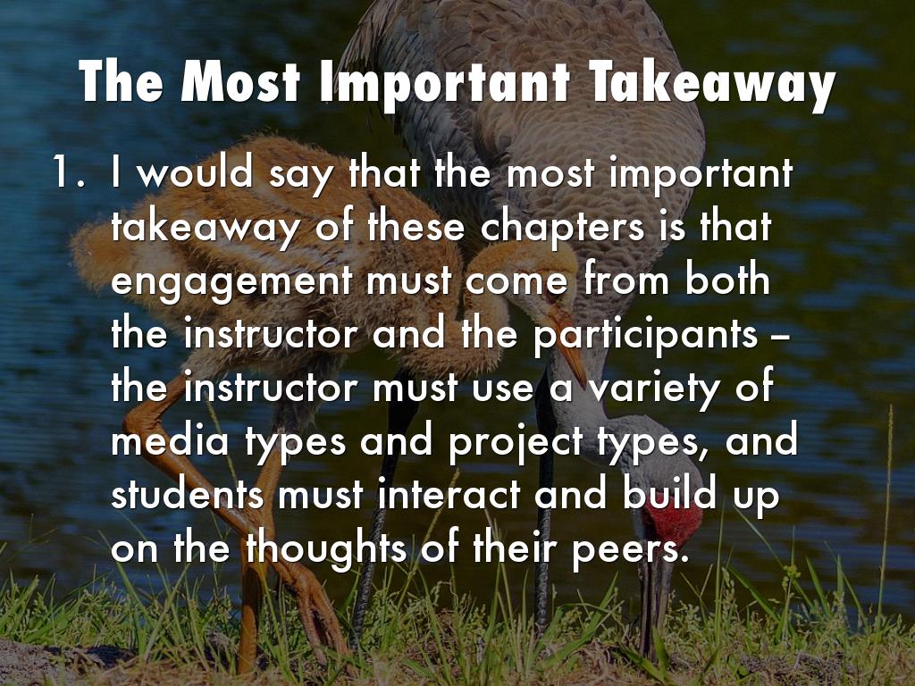 I would say that the most important takeaway of these chapters is that engagement must come from both the instructor and the participants -- the instructor must use a variety of media types and project types, and students must interact and build up on the thoughts of their peers.