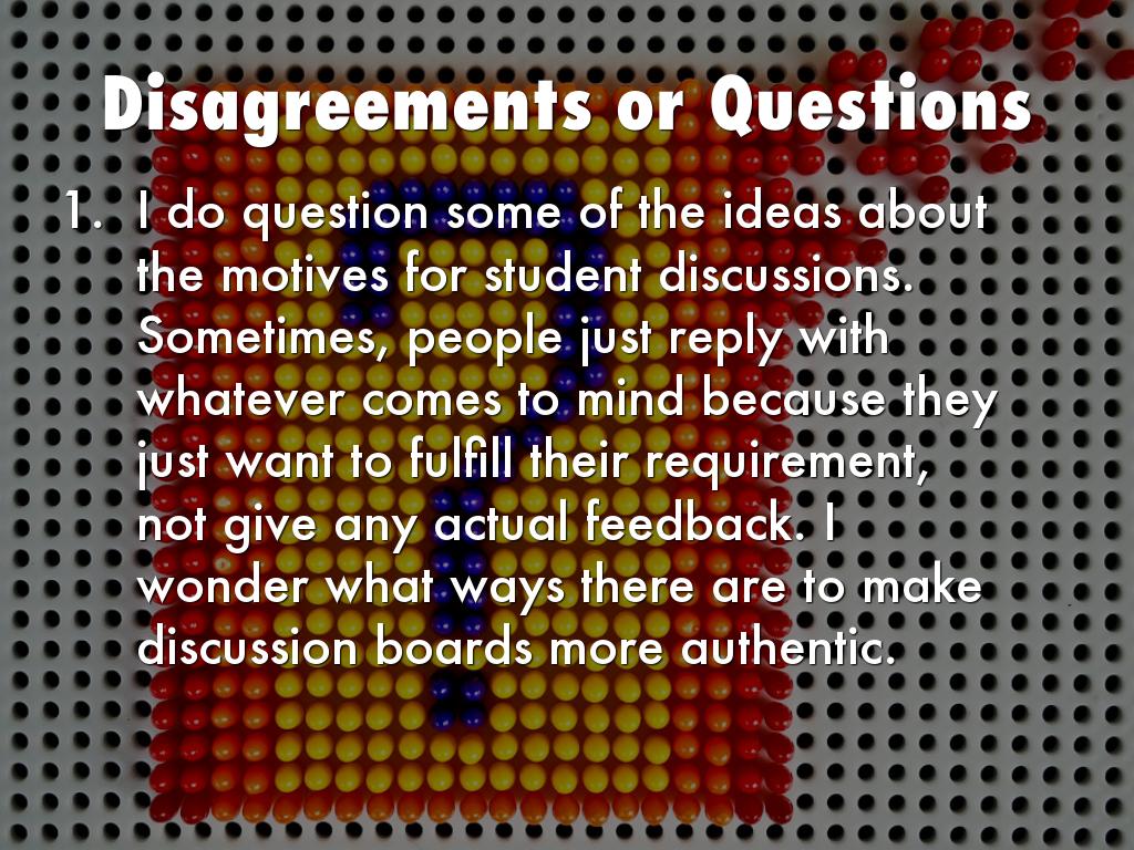 I do question some of the ideas about the motives for student discussions. Sometimes, people just reply with whatever comes to mind because they just want to fulfill their requirement, not give any actual feedback. I wonder what ways there are to make discussion boards more authentic.