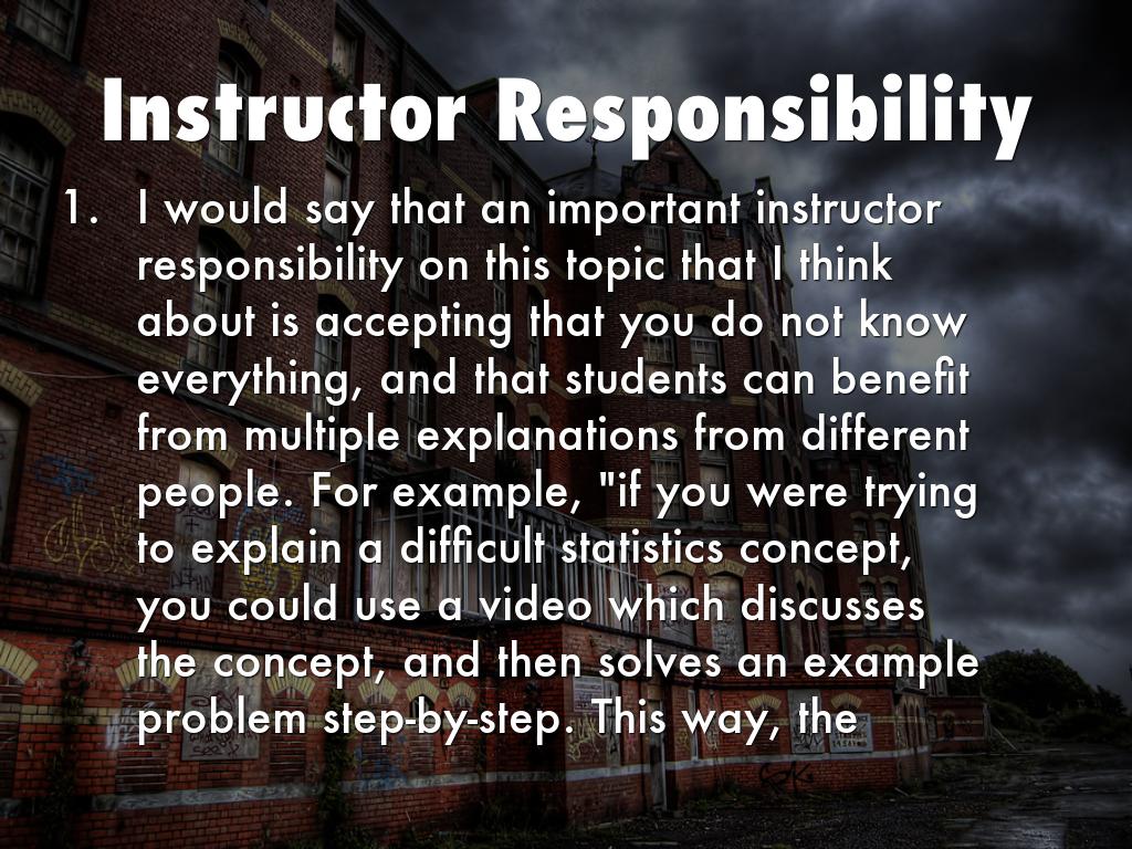 I would say that an important instructor responsibility on this topic that I think about is accepting that you do not know everything, and that students can benefit from multiple explanations from different people. For example, "if you were trying to explain a difficult statistics concept, you could use a video which discusses the concept, and then solves an example problem step-by-step. This way, the learner can go back and review the video as many times as necessary, whenever they may have questions" (Levally). Seeing multiple explanations can clarify and expand knowledge effectively.