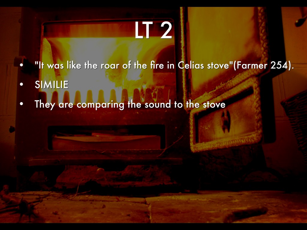 "It was like the roar of the fire in Celias stove"(Farmer 254).