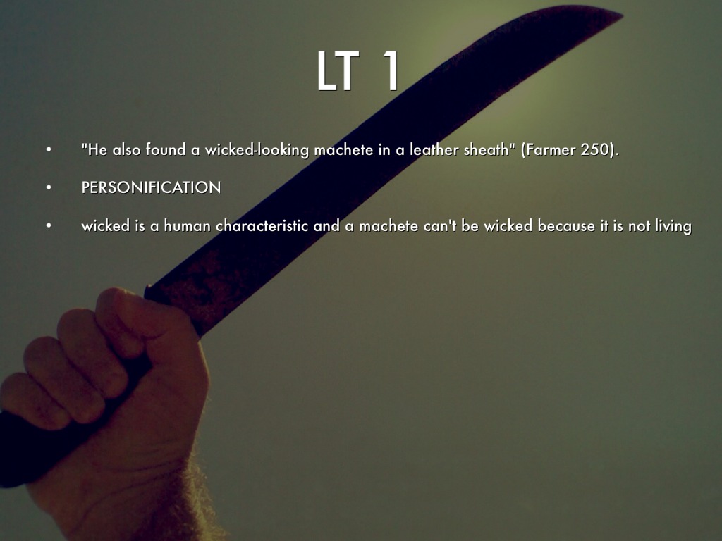 "He also found a wicked-looking machete in a leather sheath" (Farmer 250).