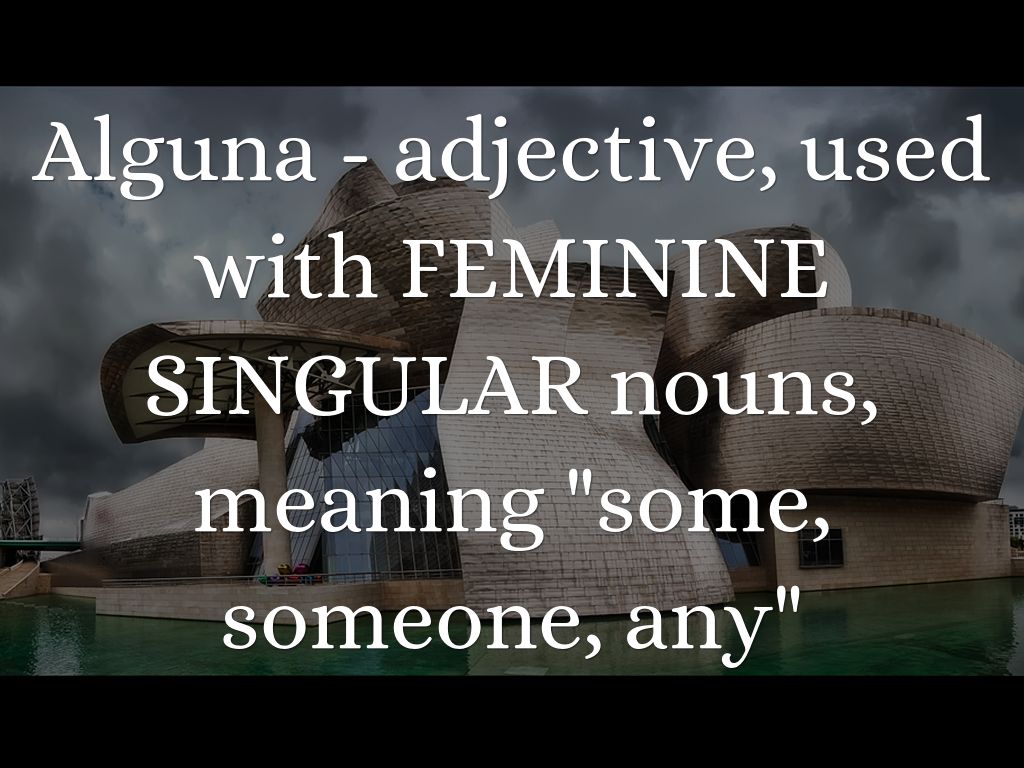 Alguna - adjective, used with FEMININE SINGULAR nouns, meaning "some, someone, any"
