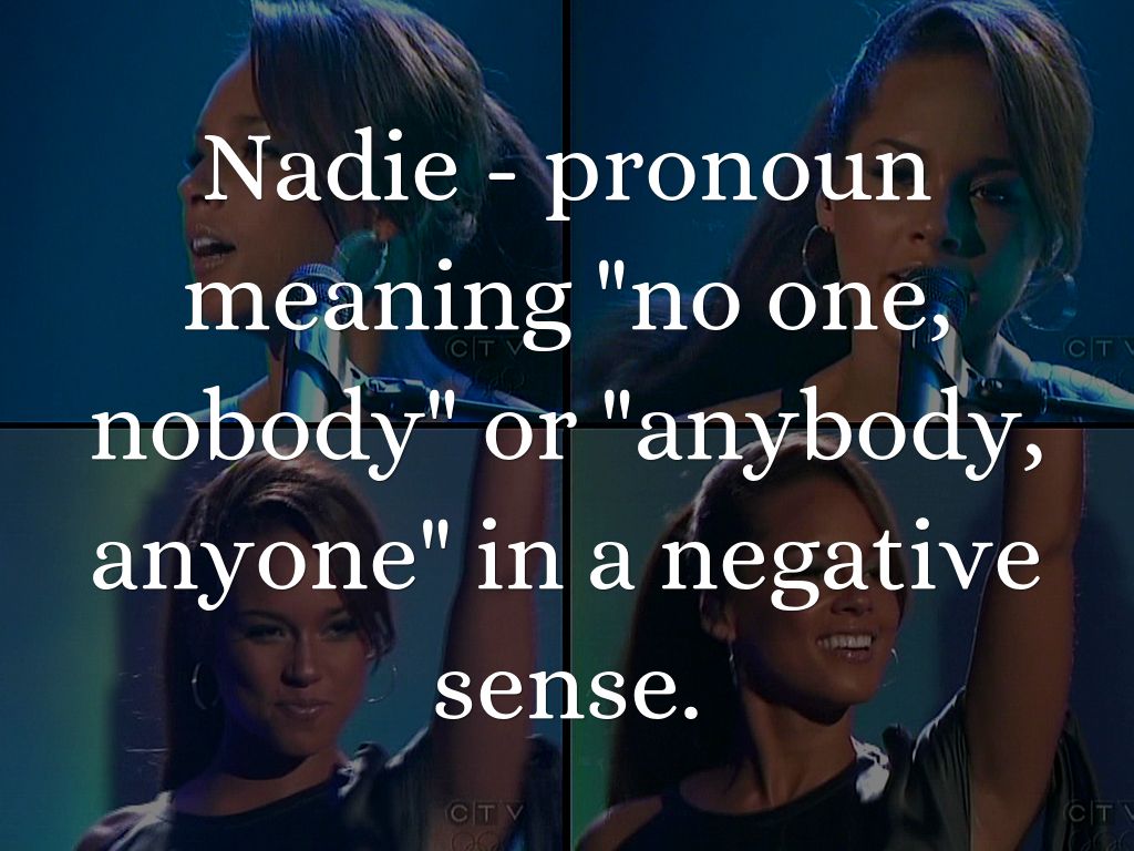 Nadie - pronoun meaning "no one, nobody" or "anybody, anyone" in a negative sense.