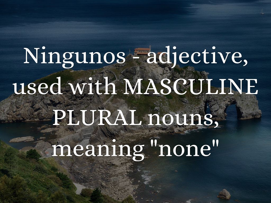 Ningunos - adjective, used with MASCULINE PLURAL nouns, meaning "none"