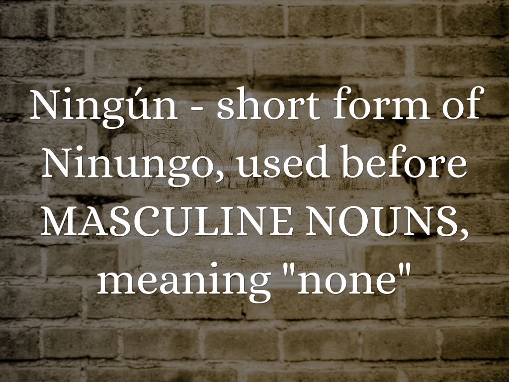 Ningún - short form of Ninungo, used before MASCULINE NOUNS, meaning "none"