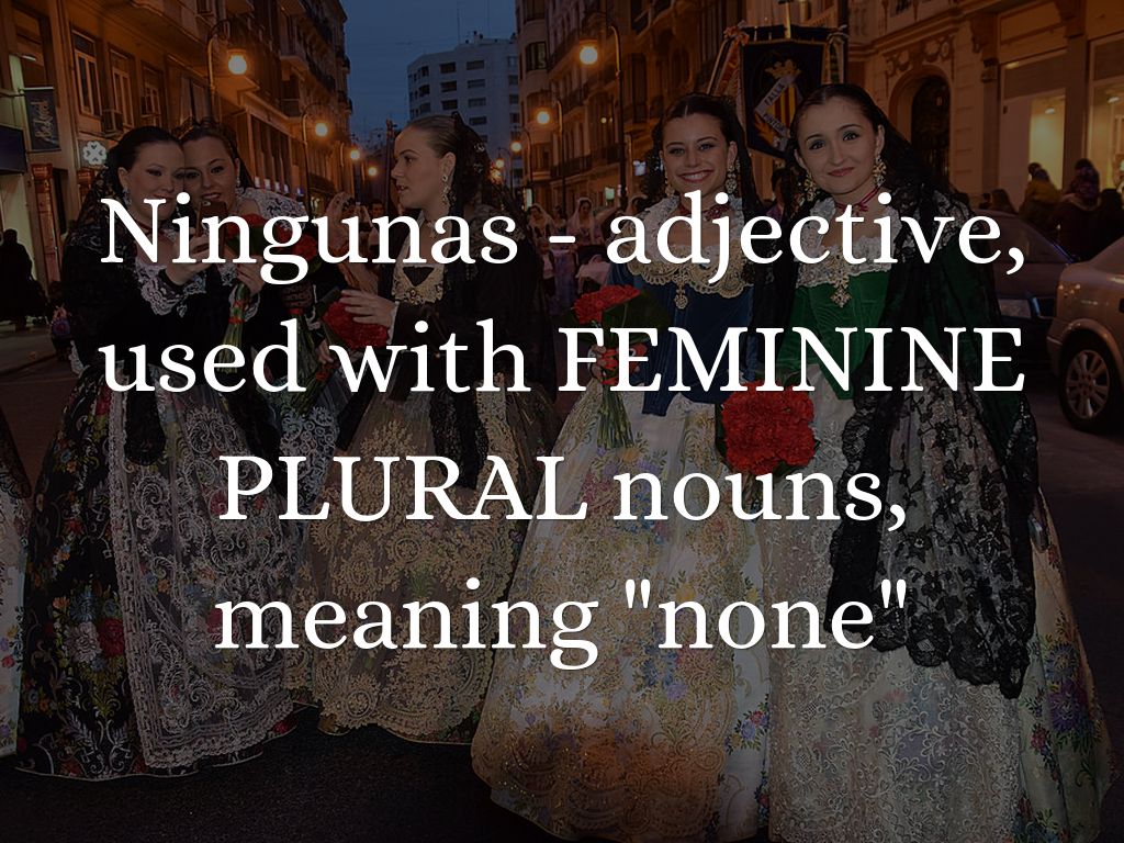 Ningunas - adjective, used with FEMININE PLURAL nouns, meaning "none"