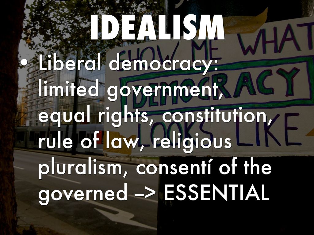 Liberal democracy: limited government, equal rights, constitution, rule of law, religious pluralism, consentí of the governed --> ESSENTIAL