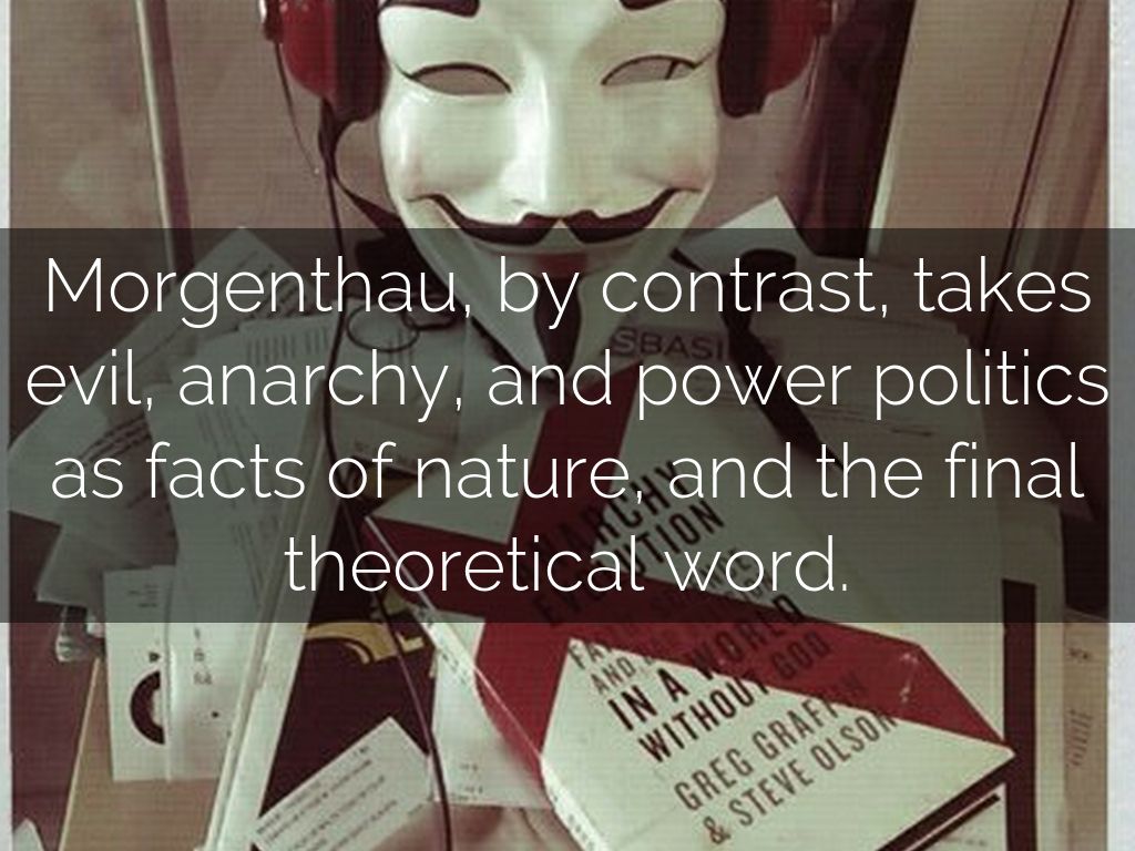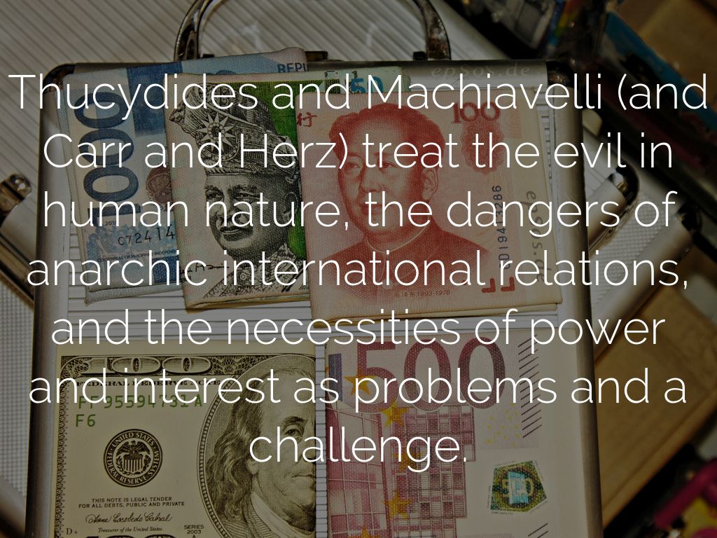 Thucydides and Machiavelli (and Carr and Herz) treat the evil in human nature, the dangers of anarchic international relations, and the necessities of power and interest as problems and a challenge.