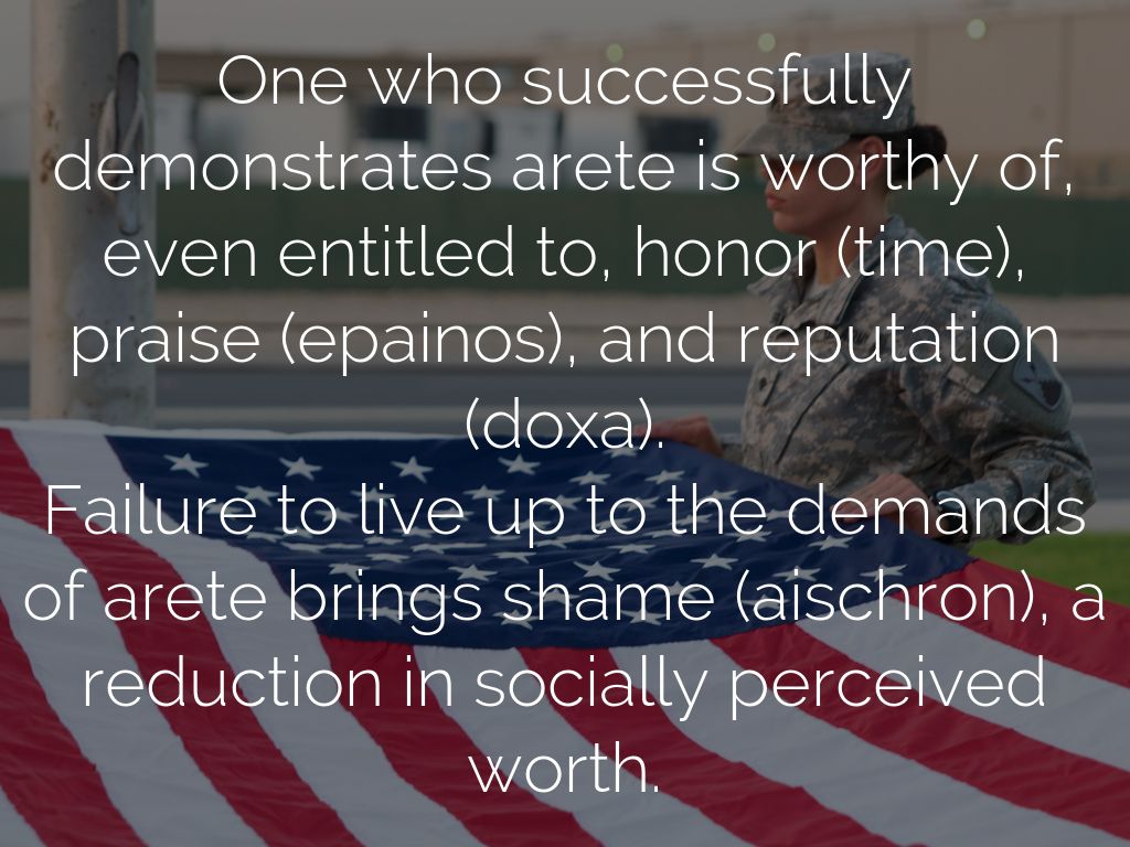 One who successfully demonstrates arete is worthy of, even entitled to, honor (time), praise (epainos), and reputation (doxa). Failure to live up to the demands of arete brings shame (aischron), a reduction in socially perceived worth.