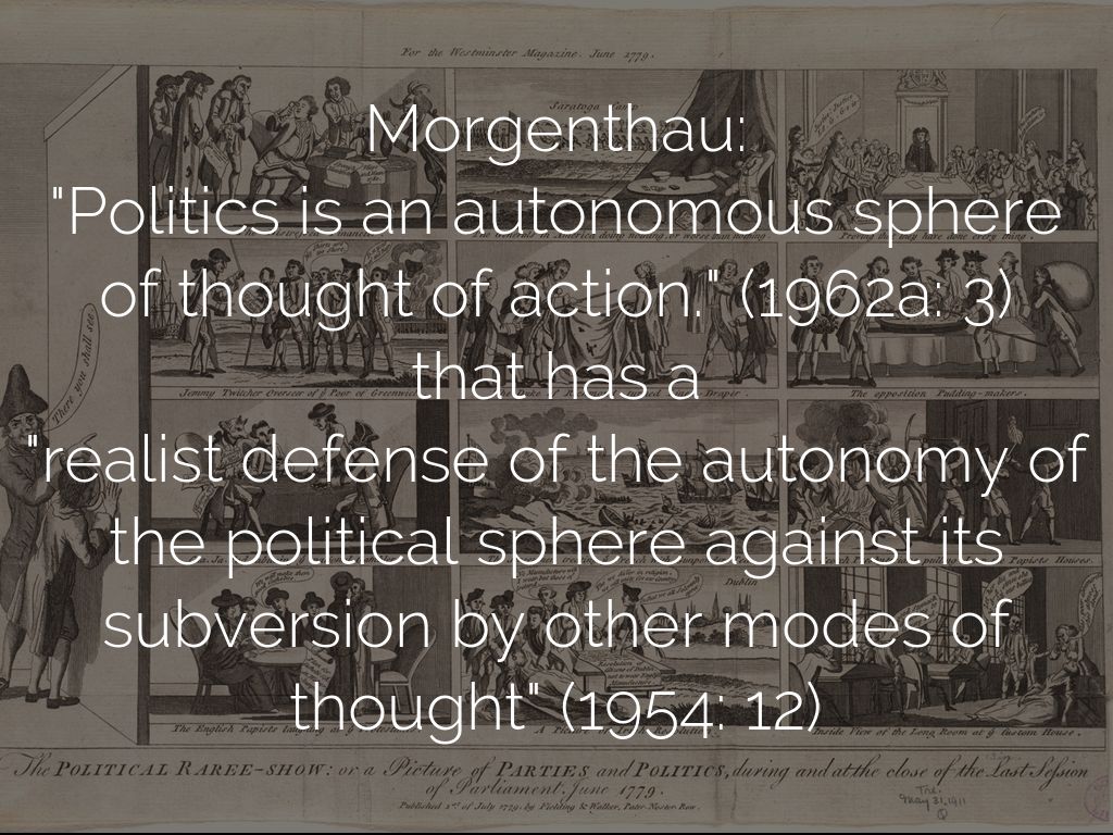 Morgenthau: "Politics is an autonomous sphere of thought of action." (1962a: 3) that has a "realist defense of the autonomy of the political sphere against its subversion by other modes of thought" (1954: 12)