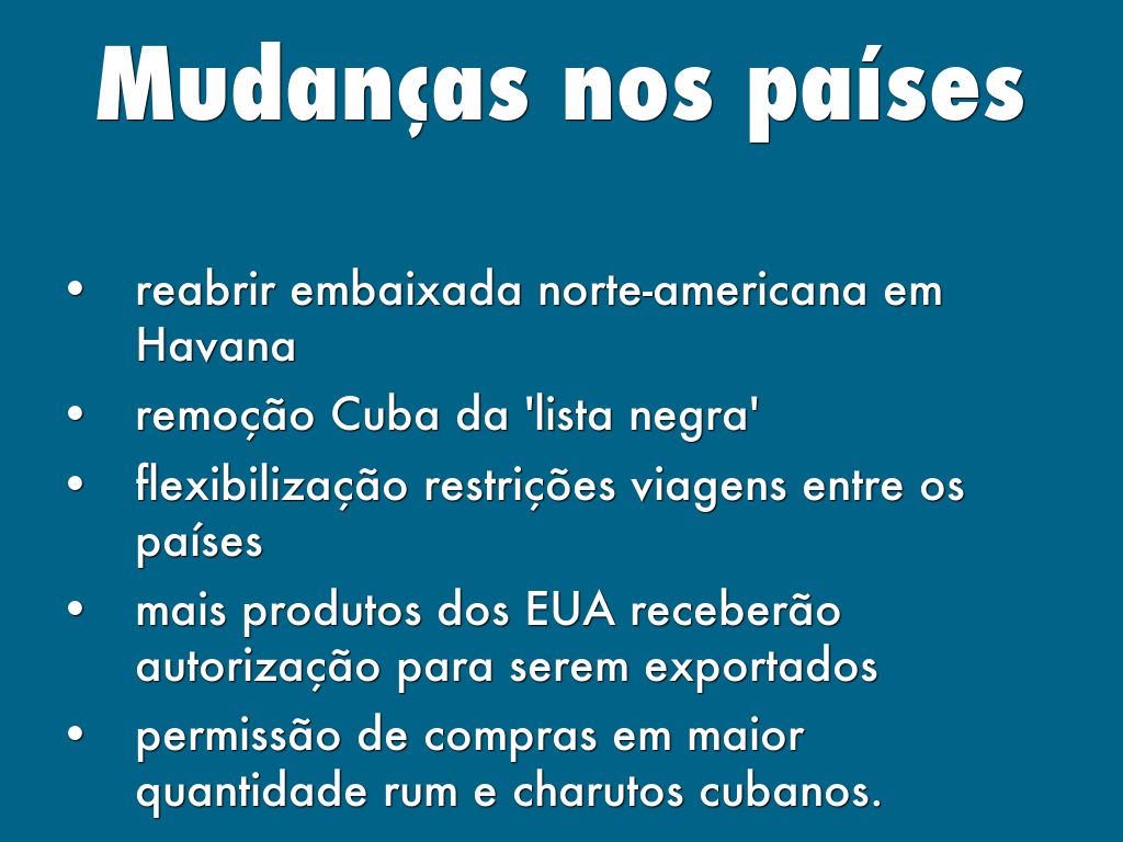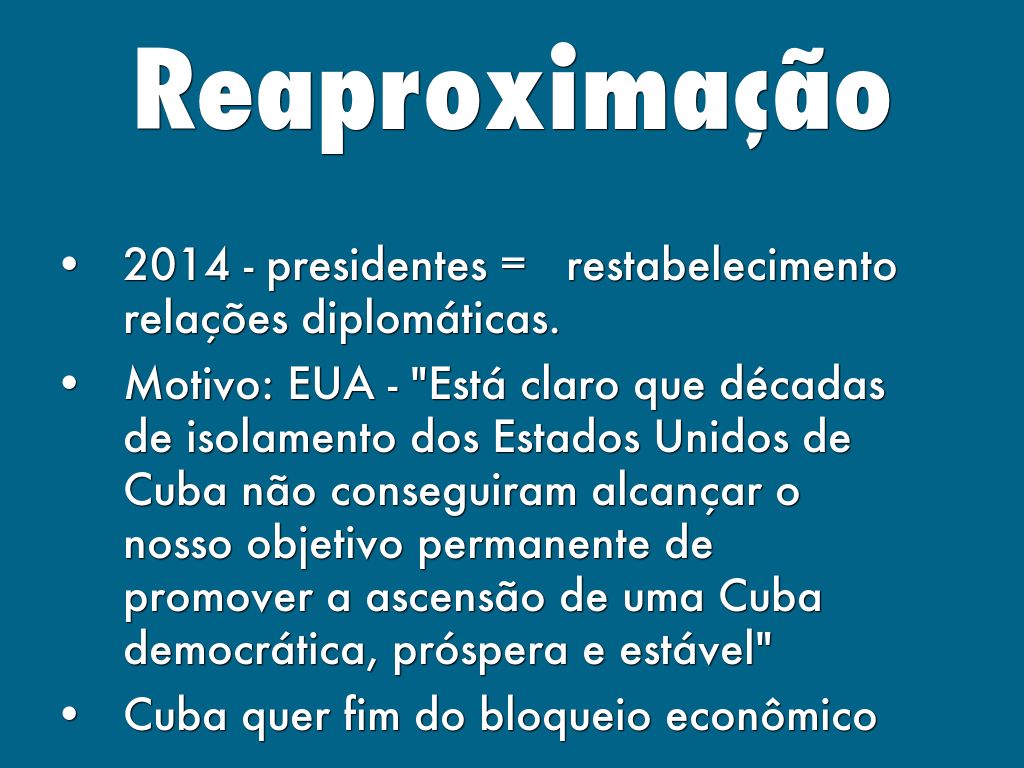 Motivo: EUA - "Está claro que décadas de isolamento dos Estados Unidos de Cuba não conseguiram alcançar o nosso objetivo permanente de promover a ascensão de uma Cuba democrática, próspera e estável"