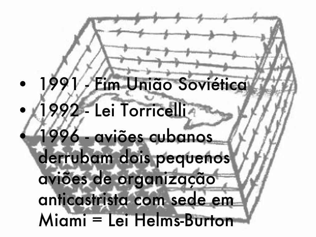 1996 - aviões cubanos derrubam dois pequenos aviões de organização anticastrista com sede em Miami = Lei Helms-Burton